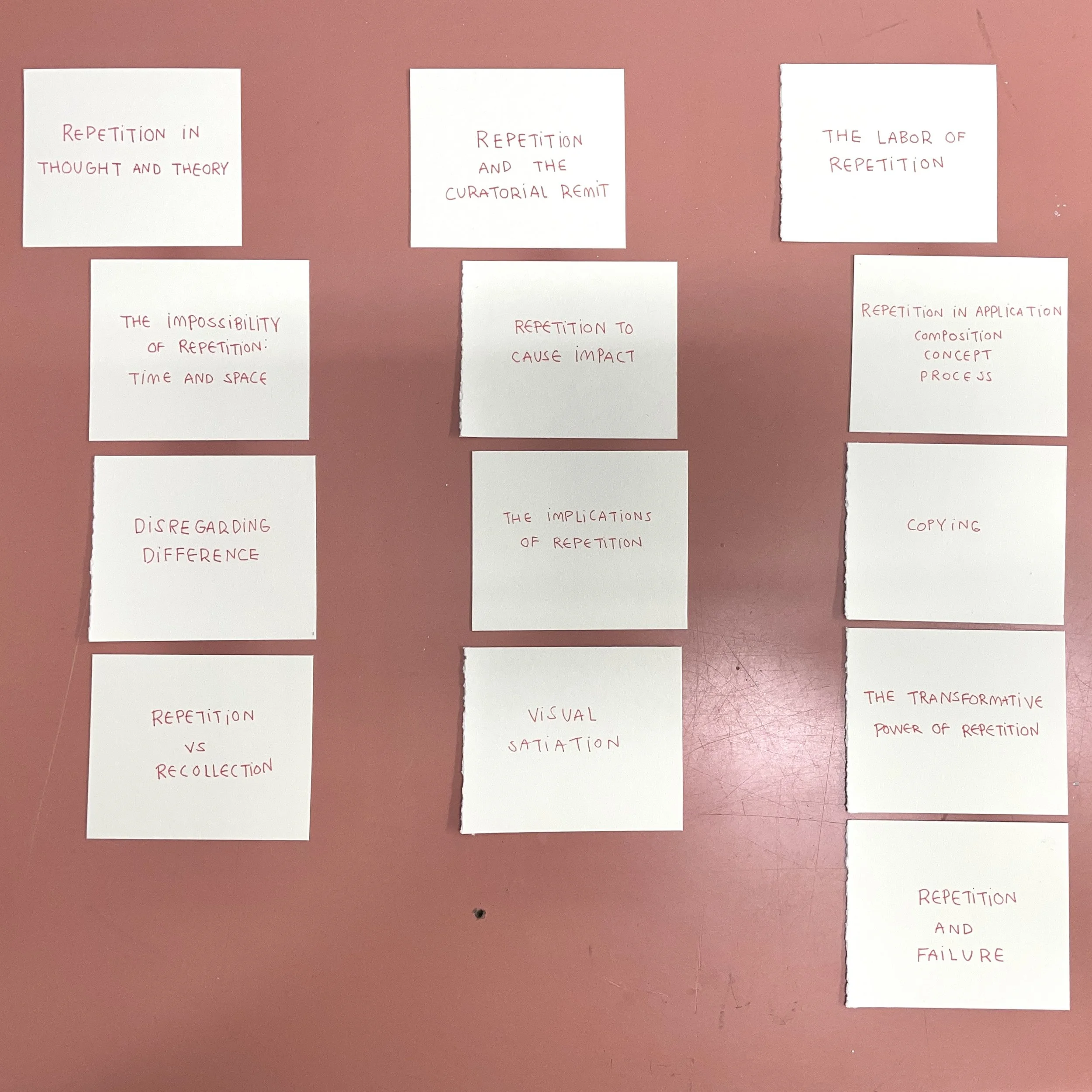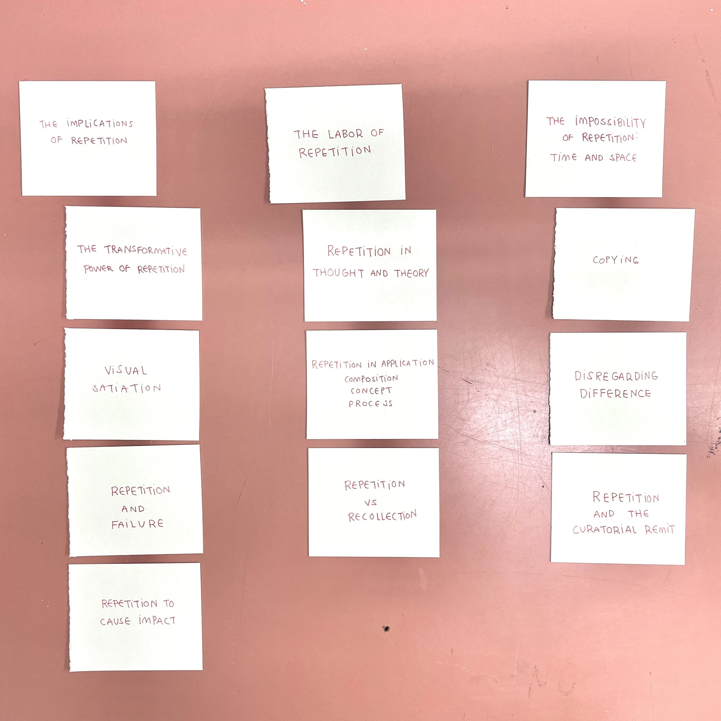 This exercise also helped me cut out branches of research that I had planned on, i.e., the effect of repetition on a visual artist’s mind/mental health and body. While these two areas of research are still important to me and might come up in this project, they seem like they lead to a different set of questions and findings; they feel like an entirely different dissertation, based more in medical research.
